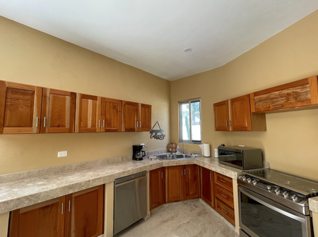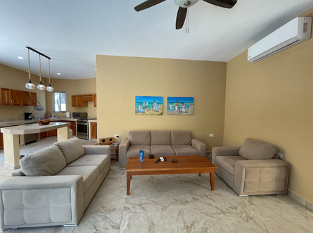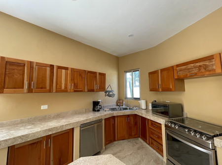 Sala, comedor y cocina abierta totalmente equipada (estufa, lavavajillas, refrigerador, microondas y más)